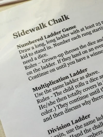 I'm currently keeping a list of fun math-related activities on the clipboard so that we can get some kinesthetic practice in for The-Boy-Who-Never-Stops-Moving. I'm sorry to say that I have no idea where this came from; do a google search and see if you can find a similar list.