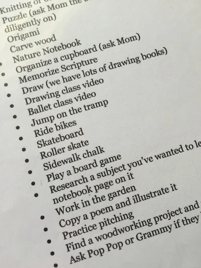 When a child bemoans his boredom or aimlessly wanders the house looking for something to do, I typically say, "I'm not your cruise director." I'm getting feisty in my old age! But this list of things to do when a child doesn't know what to do is handy.