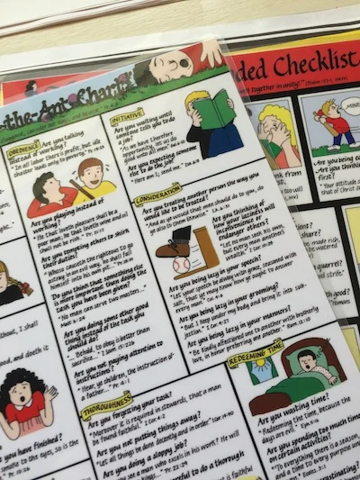 I'm a Biblical child-training loser, because when it comes time to say something profound, I'm usually upset or annoyed or bummed by things they're doing (or not doing) that I can't think Biblically. I love these small laminated charts from Doorposts. They fit on the clipboard and I can glance at them. Relevant questions are asked and Bible verses given.